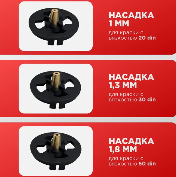 - • Насадки: 1 мм, 1.3 мм, 1.8 мм;