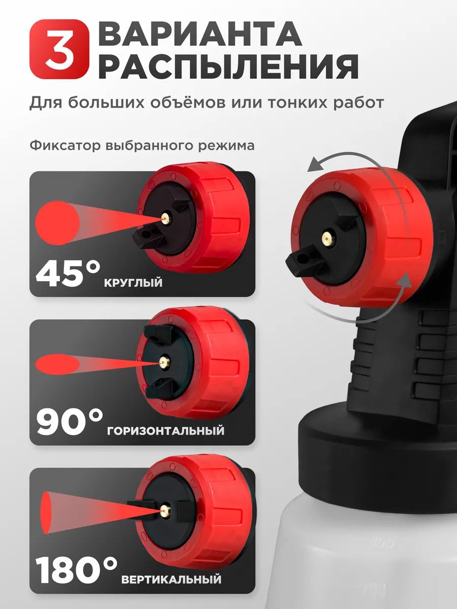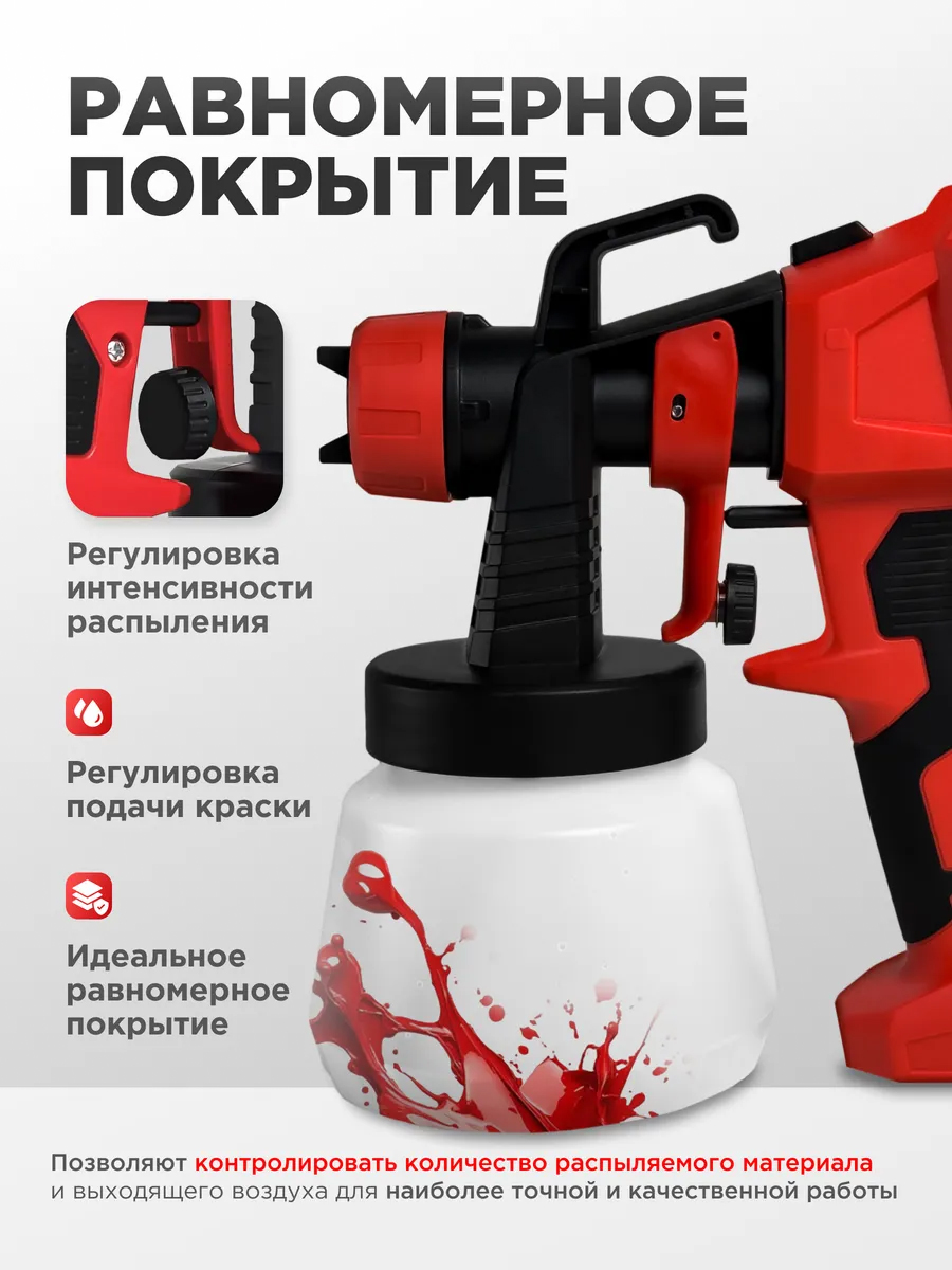 Регулируемый распылитель позволяет настроить ширину факела и расход материала, что обеспечивает адаптацию к различным задачам. Этот пульверизатор идеально подходит для отделки стен, покраски мебели, автомобилей и фасадов, обеспечивая точность нанесения и экономию краски.